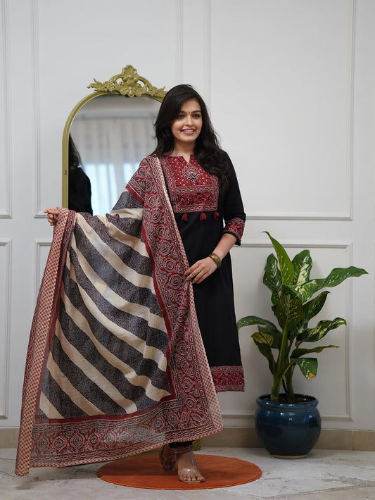 Elegant Maroon & Black Printed Kurta Set with Dupatta(RD44)