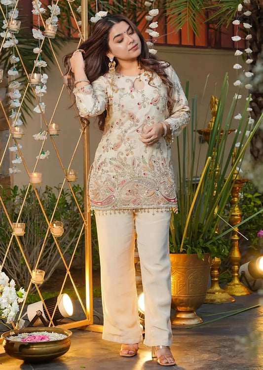 Featuring beautiful Heavy Suit Set which is beautifully decorated Embroidery 🪡 . It is paired with matching Trouser Pair.(RRR43)