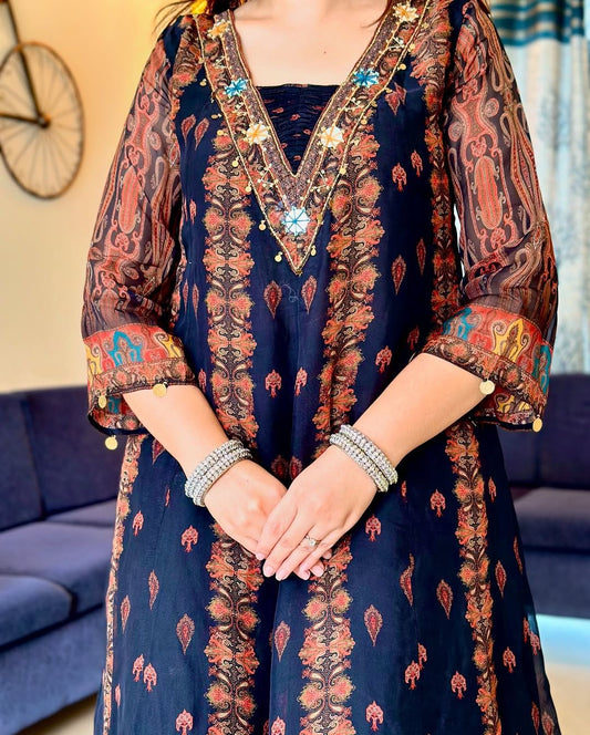 Beautiful pure premium chiffon digital printed Anarkali set with handwork on neck it has attached lining paired up with santoon slik pant and Organza digital printed dupatta sets(SWRED23)