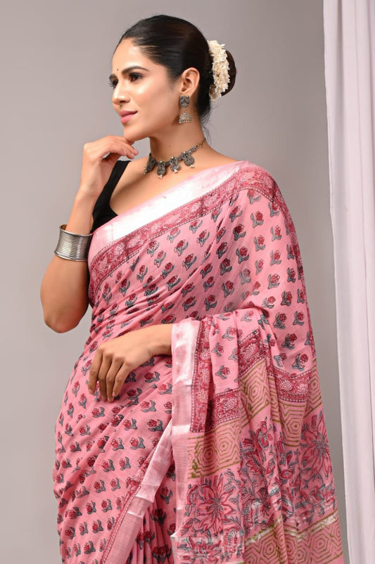Hand Block Printed Linen Saree With Unstitched Blouse (SWSRLIL24)