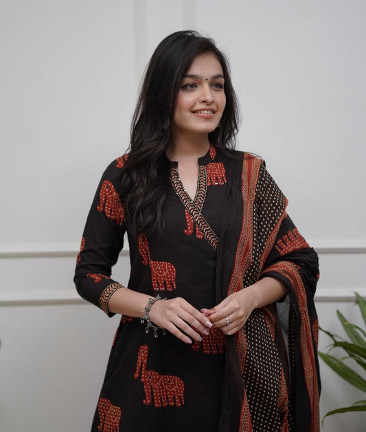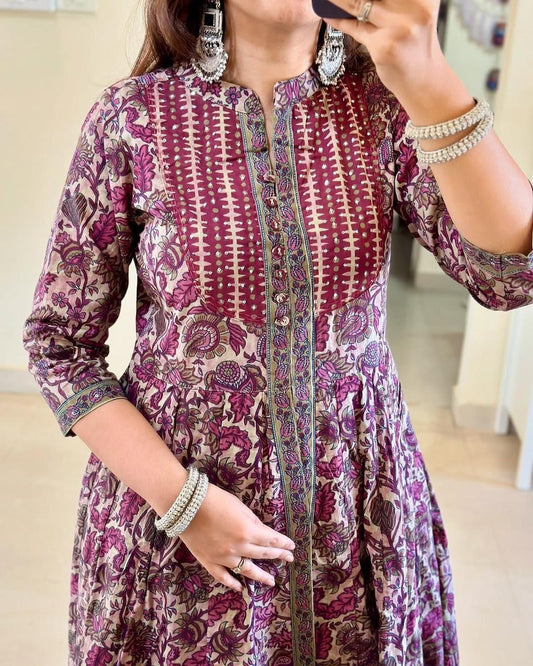 New Full Cotton Print Hand Work Anarkali Kurti Pant With Malmal Dupatta (Swred14)