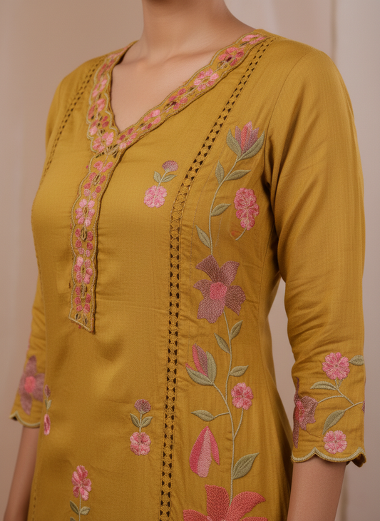 Mustard Yellow Floral Embroidered Kurta Set (SWDH21)