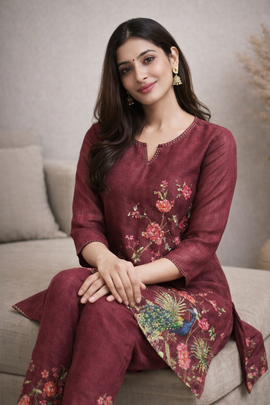 Maroon Floral Printed Kurta Set with Peacock Motif for Women (SWDH10)