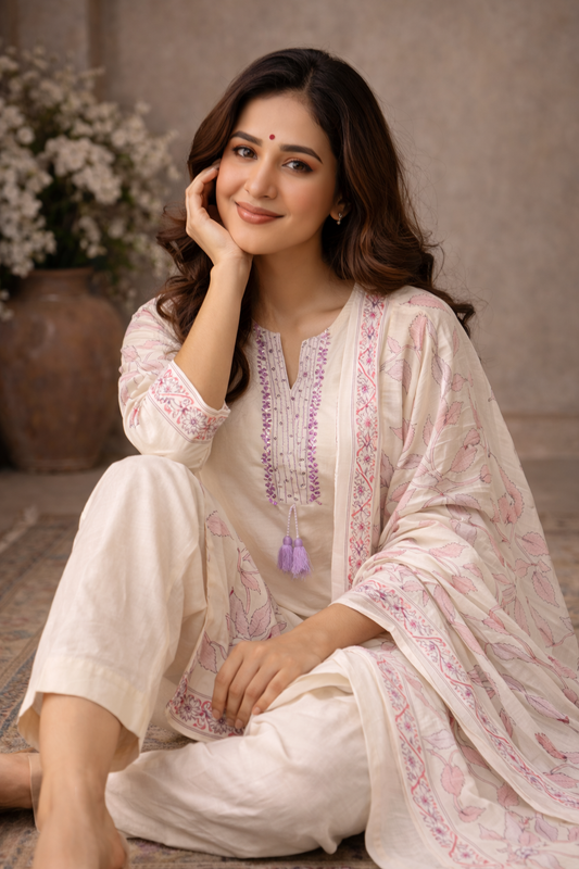 Ivory Floral Printed Kurta Set with Matching Dupatta for Women (SWDH14)