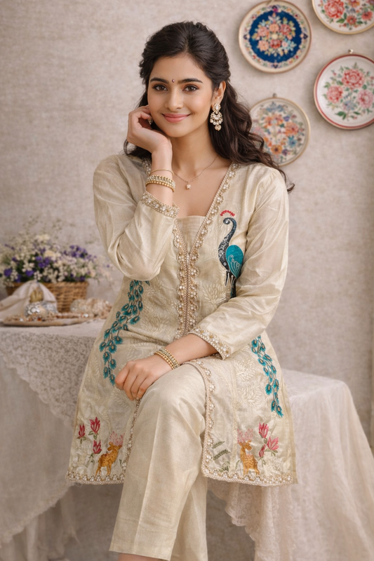 Elegant Ivory Peacock Embroidered Kurta Set (SWDH18)