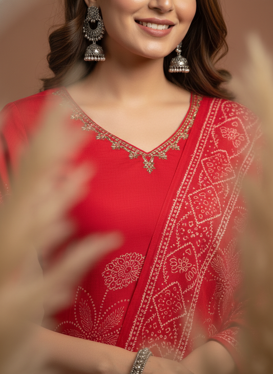 Red Embroidered Kurta Set with Matching Dupatta for Women (SWDH13)