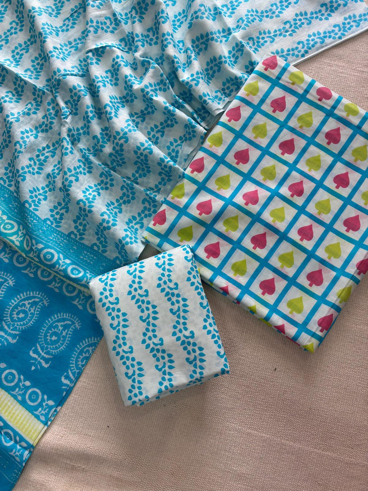 ELEGANT HAND BLOCK PRINT COTTON SUIT SET WITH MULMUL DUPATTA(WACOTMU79)