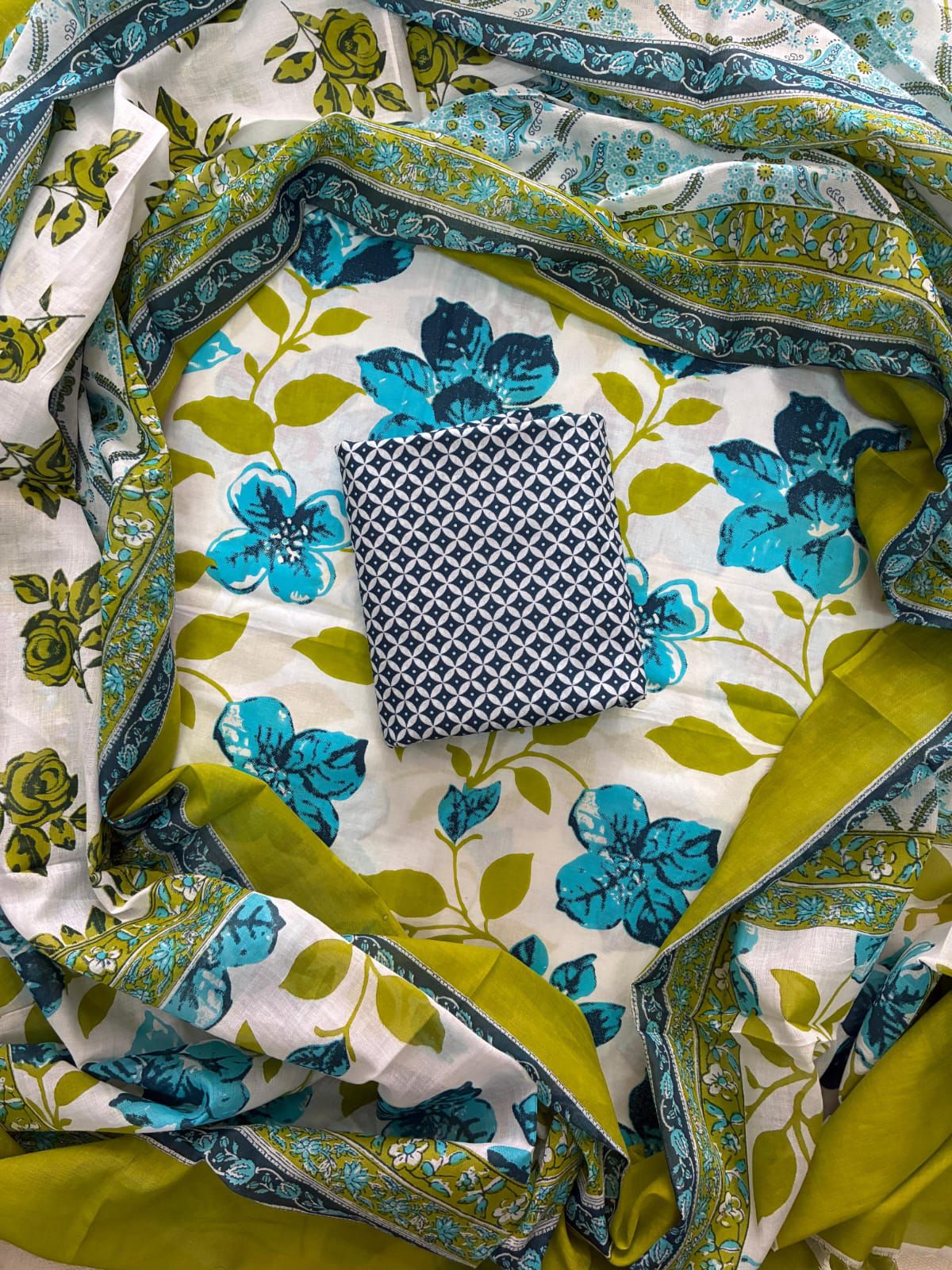 Designer Hand Block Print Cotton Suit Set with Mulmul Dupatta(WACOTMU118)