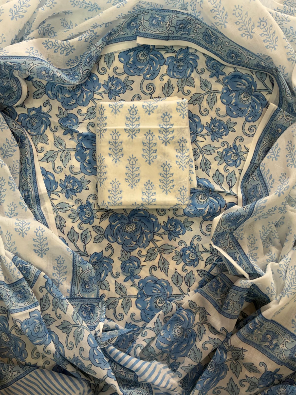 Designer Hand Block Print Cotton Suit Set with Mulmul Dupatta(WACOTMU144)