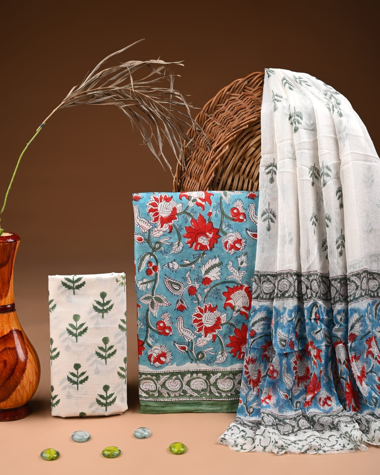 JAAL HAND BLOCK PRINT COTTON SUIT SET WITH CHIFFON DUPATTA(WACFCOTMU85)