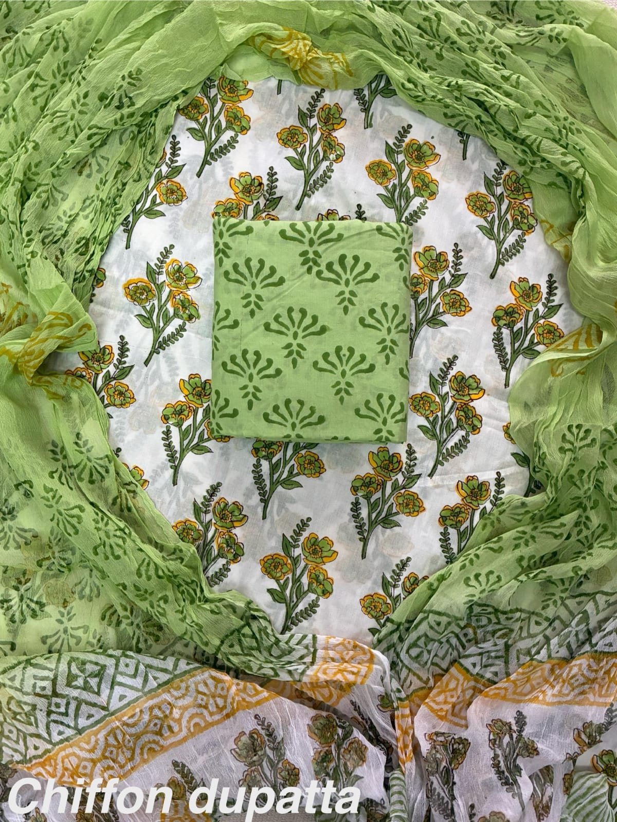 New Premium Hand Block Print Cotton Suit Set with Chiffon Dupatta(WACFCOTMU18)